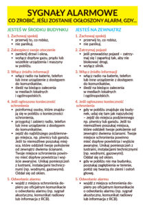 - zapamiętaj jakie są rodzaje sygnałów alarmowych i co oznaczają poszczególne dźwięki: