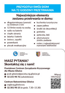 - zapasy w domu na co najmniej 72 godziny – szczegółowe informacje, co warto mieć w domu, znajdziesz na stronach 21-22 Poradnika bezpieczeństwa albo w poniższej ulotce;